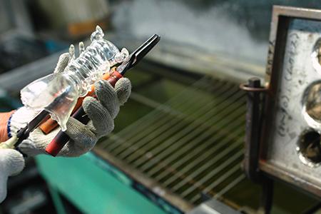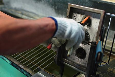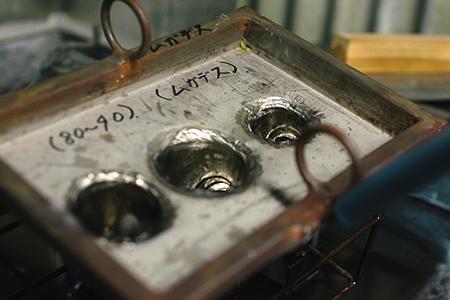 銀鏡を施した蝋製の型を硫酸銅溶液に浸し、電気分解の原理で最低でも4日もの時間をかけてロウ型の周囲に銅のメッキを形成していきます。