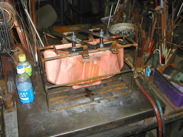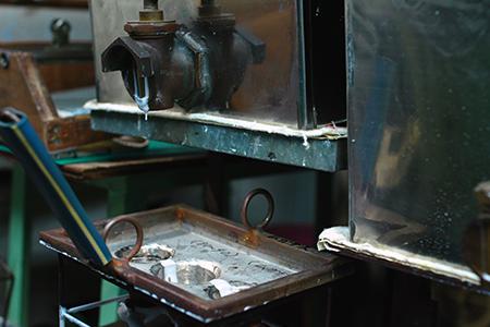 銀鏡を施した蝋製の型を硫酸銅溶液に浸し、電気分解の原理で最低でも4日もの時間をかけてロウ型の周囲に銅のメッキを形成していきます。